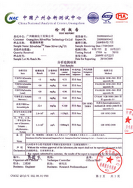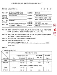 | 广东省产品质量监督检验中心-银康纳米银检测报告 检测表明:金色葡萄球菌的杀菌率在24小时内高达99.74% 大肠埃希氏菌的杀菌率在24小时内高达99.60% | ||