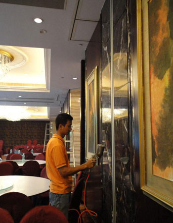 3、表面清洁,用干净的拖把将宴会厅的表面(除玻璃这外)擦一遍,用吸尘机将地毯上的脏物清理掉,主要目的去除表面的尘埃,确保光触媒涂层的粘着能力,以免影响其效果;