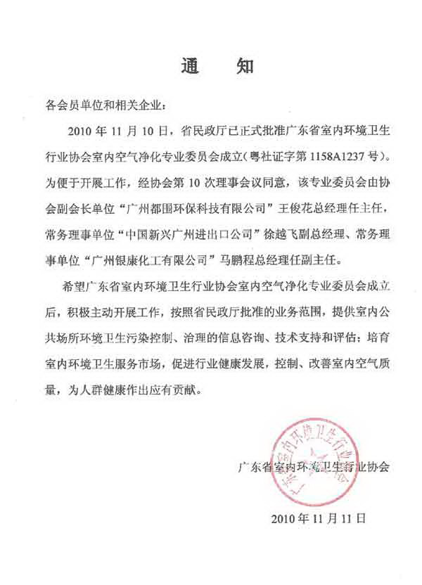 据广东省室内环境卫生行业协会2010年11月11日通知,我司总经理马鹏程先生担任广东省室内环境卫生行业协会室内空气净化专业委员会副主任一职。