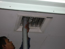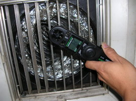 在风管开一个洞以便将机器人放入风管进行清洗 银康处理后测量风速,以确保工程质量