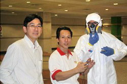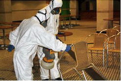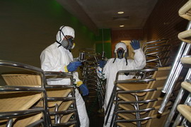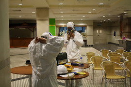 将需进行霉菌处理的椅子集中在一个密闭的空间 工程人员全副武装