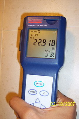 处理前表面细菌数采样 处理前测得表面细菌数为22918RLU