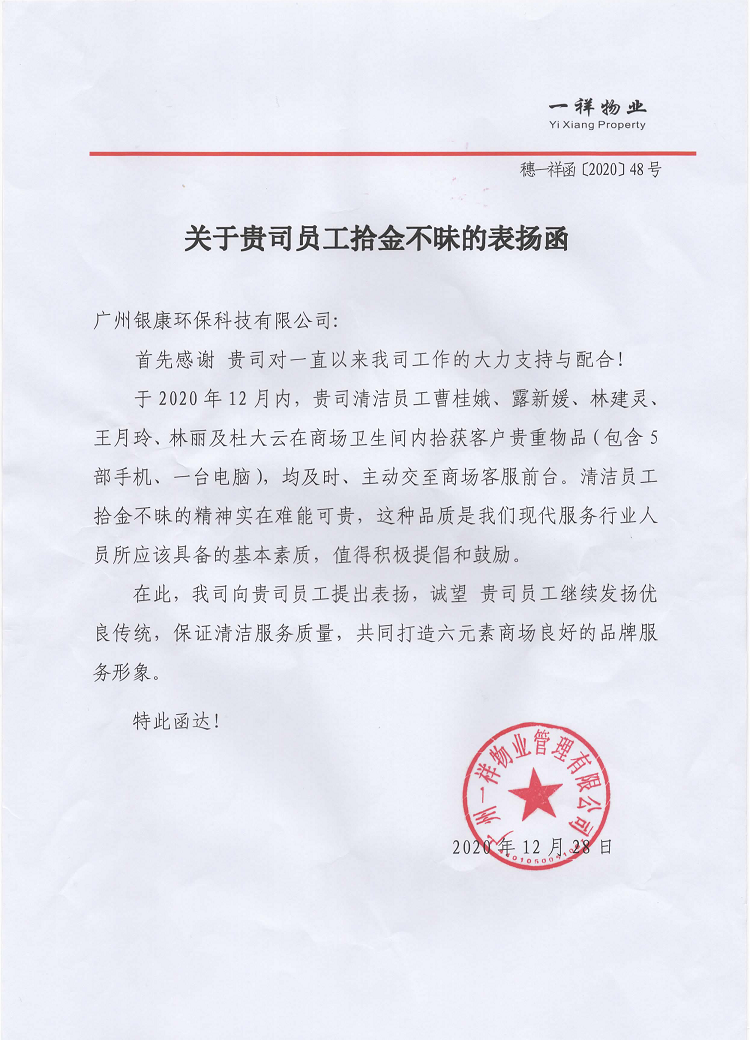收到广州一祥物业管理有限公司的表扬函